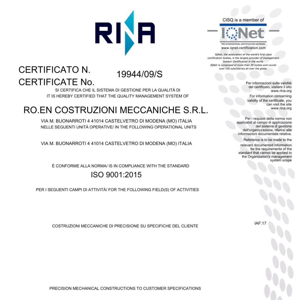 RO.EN è certificata ISO 9001 dal 2009, con Certificato Sistema Qualità N.19944/09/S emesso da RINA Services S.p.A.